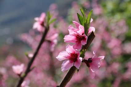 在瀘定縣冷磧鎮(zhèn)、德威鎮(zhèn)等地,桃花、油菜花及櫻花競相開放,一團團、一簇簇,綴滿枝頭,藍天、白云與各色花兒相交,金黃花海在微風中起伏。一畦畦油菜花田錯落有致、層次分明,綿延不斷?!岸聶鸦ㄩ_,三月桃花盛,四月紅櫻桃,五月水蜜桃?!背擞筒嘶?,每年陽春三月,瀘定的桃花也隨著和煦春風落滿枝頭滿樹的花芽沁著香氣,一點點溢到空氣中,香了春風,也香了整座城。
