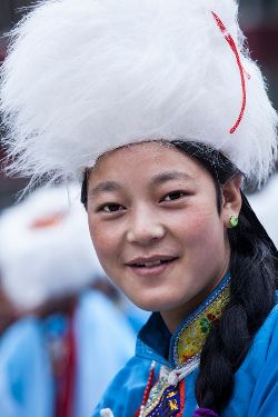 藏裝的基本特點是長袖、寬腰、大襟、肥大。直線寬邊,色彩對比強烈。男女藏袍均習慣以粗紡厚毛呢為料,左襟大,右襟小,一般在右腋下釘一個紐扣,或是用紅、藍、綠、雪青等色布做兩條飄帶,穿時結(jié)上。男式藏袍多為黑、白兩色,領(lǐng)圍、袖口、衣襟和底邊,鑲上色布或綢子底邊,古樸渾厚。夏天或勞動時,一般只穿左袖,右袖從后面拉到胸前搭在左肩上,也可左右袖均不穿,兩袖束在腰間,古銅色的皮膚袒露于外,雄風凜凜,彪悍剛健。女式藏袍,分有袖和無袖的兩種,夏秋兩季的藏袍無袖。里面多襯有紅、綠等色彩鮮艷的襯衣,襯衣翻領(lǐng)在外,衣袖要長于胳膊一至二倍,長出部分,平時卷起,舞蹈時放下,舒展飄逸,瀟灑自如。藏族的帽子式樣繁多,各地均有不同,拉薩等地以金寶頂帽為最多,用金絲或銀絲繡織圖案,在陽光照耀下,閃閃發(fā)光。金花帽是男女老幼都喜歡戴的民族帽。男女穿的藏靴,底高二寸,靴腰高至小腿以上,靴面用紅綠相間的毛呢裝飾,繡有圖案花紋。靴頭向上隆起。藏族男女喜歡佩飾。耳穿大環(huán),手腕金銀,頂戴珠鏈,尤其是在腰間,男挎長劍,女佩腰刀,更顯得粗獷彪美。