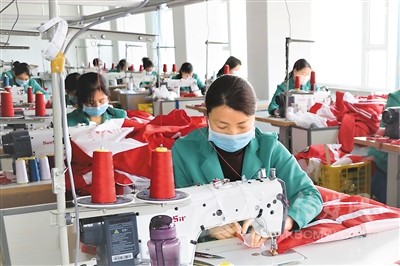 近期,甘肅省平?jīng)鍪徐o寧縣在做好疫情防控工作的同時,積極推動縣內扶貧車間復工復產(chǎn)。截至目前,全縣57家扶貧車間已有39家恢復生產(chǎn),吸納帶動了536名貧困群眾在家門口就業(yè),增收致富。圖為靜寧縣城關鎮(zhèn)的村民在當?shù)匾患曳鲐氒囬g縫制衣服。王 毅攝(人民視覺)