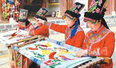 3月27日,繡娘正在陜西省漢中市寧強(qiáng)縣青木川羌繡傳習(xí)基地生產(chǎn)羌繡繡品。