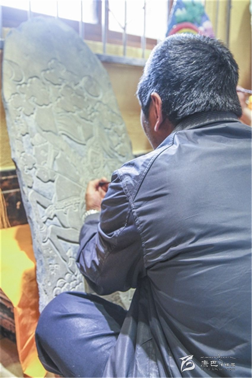 “刻一幅一米高、八十公分寬的作品,一般用時在一個月以上。”所彭接過巴德的話說,在格薩爾彩繪石刻中,最理想的尺寸就是一米高、八十公分寬。但由于各種原因,現(xiàn)在很不容易找到這么大、又適合石刻的石板。此外,也有一些人采用機器進行刻制,但這就失去了藝術的本來價值。