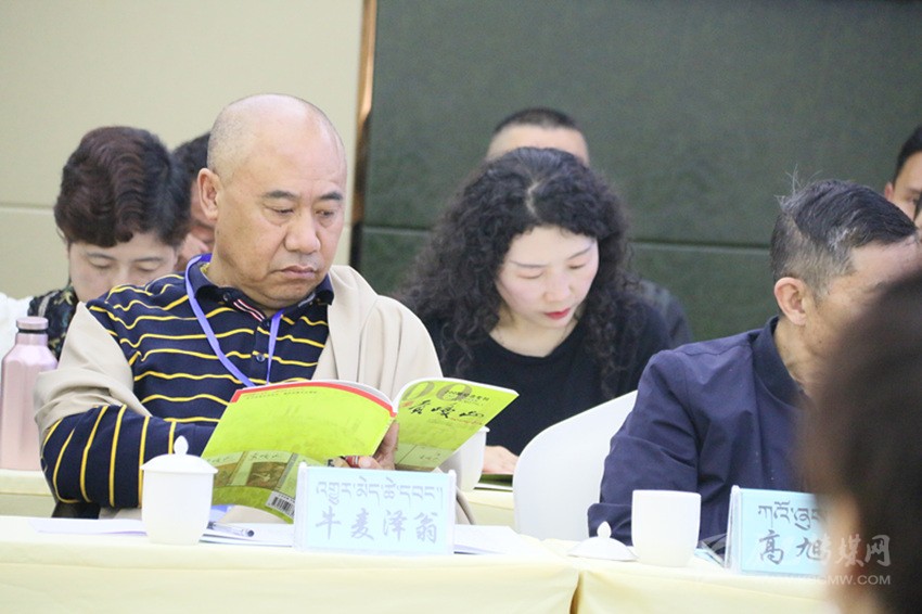 會議室正中的電子屏上,“貢嘎山期刊交流暨2019年藏漢文作家培訓會”白色字體赫然入目。室內最靠后的桌上,《貢嘎山》200期紀念??ⅰ敦暩律健返?99期等藏漢文讀物有序擺放,吸引了不少“粉絲”當場品讀。