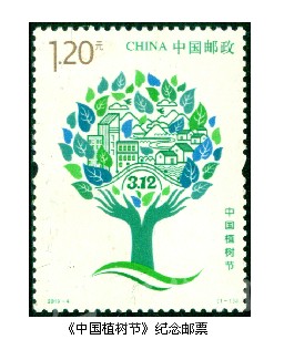 2019年是中國的植樹節(jié)設(shè)立40周年。3月12日,中國郵政發(fā)行一枚《中國植樹節(jié)》紀念郵票。郵票畫面以綠色為基調(diào),圖案主體為雙手托起的綠色家園,手臂代表樹干、張開的五指代表樹枝,寓意大家親自動手,植樹造林,為改善生活環(huán)境做出一份貢獻,同時也寓意人類是肩負改善地球環(huán)境重任的主要力量。樹干枝頭上方是生機盎然的綠葉,層層綠葉中設(shè)計點綴了象征城鎮(zhèn)、鄉(xiāng)村、河流、山川、藍天白云、飛鳥的符號化圖形,寓意通過全民植樹造林活動,改善生態(tài)和生活環(huán)境,共同創(chuàng)造綠水青山的美麗中國。