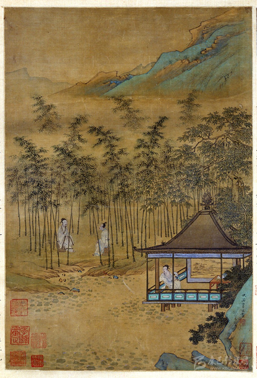 此圖意境極像唐代詩(shī)人王維的藍(lán)田山別墅。這里林木茂密,山澗淙淙,館舍、房屋散布其間,每到夏季,山風(fēng)習(xí)習(xí),涼爽怡人,王維和文友們?cè)诖硕认谋苁?,垂釣飲酒,談?wù)撛?shī)文,修身養(yǎng)性,過著悠閑自在的隱居生活。他在《竹里館》一詩(shī)里寫過自己的隱居快樂感受:“獨(dú)坐幽篁里,彈琴?gòu)?fù)長(zhǎng)嘯。深林人不知,明月來相照?!比?shī)格調(diào)幽靜閑遠(yuǎn),仿佛詩(shī)人的心境與自然的景致全部融為一體了。宋朝詩(shī)人楊萬里喜歡在皎潔的月光之下,清輝孤影,來到搖曳的竹林中,聽著夏夜里悅耳的蟲鳴,夜深氣清,盡管沒有涼風(fēng)送爽,但是悶熱暑氣頓時(shí)消失,于是他寫了一首《夏夜追涼》詩(shī):“夜熱依然午熱同,開門小立月明中。竹深樹密蟲鳴處,時(shí)有微涼不是風(fēng)?!?/span>
