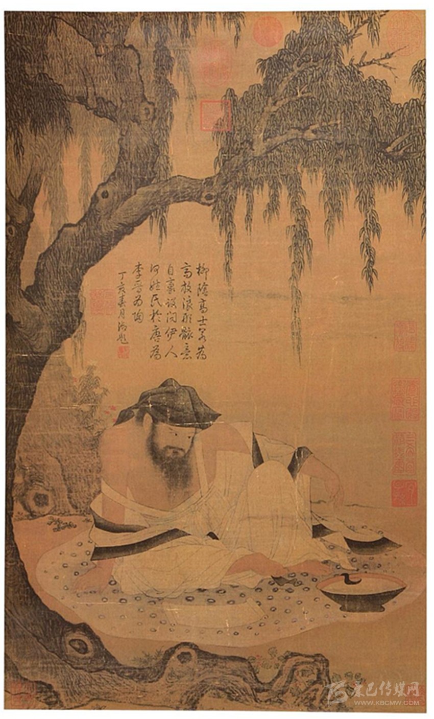 陶淵明曾說:“夏月虛閑,高臥北窗之下,清風(fēng)颯至,自謂羲皇上人。”一個(gè)高人隱士酒后高臥草廬窗下,悠閑自得乘涼的形象躍然紙上。唐代詩(shī)人李白非常向往陶淵明恬淡閑逸、與世無爭(zhēng)、天人合一的隱逸生活,寫詩(shī)曰:“陶令日日醉,不知五柳春。素琴本無弦,漉酒用葛巾。清風(fēng)北窗下,自謂羲皇人。何時(shí)到栗里,一見平生親?!北磉_(dá)了對(duì)陶淵明人品和理想的仰慕之情?,F(xiàn)藏于臺(tái)北故宮博物院的宋人《柳蔭高士圖》即是此意境。據(jù)《石渠寶笈》記載,此圖為素絹本著色畫,左方下有孫承澤印,右方下有北平孫氏印,左邊幅有棠村審定、蕉林二印。只知為宋人之作,相關(guān)的背景則無從查考。畫中為一棵古柳樹,樹干虬曲剛勁,枝葉繁茂。樹下一翁,美髯飄忽,袒胸露腹,頭戴葛巾,赤足席地而坐。坐前有一幅展開的手卷,酒樽滿盈,淺斟低酌。表面上看此翁雙目聚神,凝視手卷,實(shí)則已是眼餳耳熱,醺醺然不勝桮杓。清乾隆皇帝對(duì)《柳蔭高士圖》十分喜愛欣賞,在畫上御筆題詩(shī)云:“柳蔭高士若為高,放浪形骸意自豪。設(shè)問伊人何姓氏,于唐為李晉為陶。”乾隆帝說,這位高士如是唐人就是李白,如是晉人便是陶淵明。但是從服飾和環(huán)境看,應(yīng)是五柳先生陶潛也。這幅圖所表現(xiàn)的就是“心靜自然涼”。