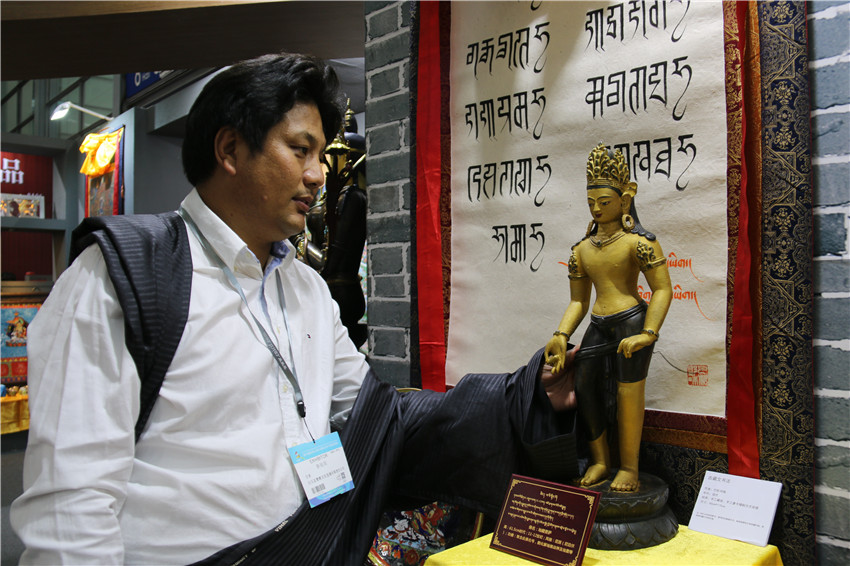 本網(wǎng)訊(記者 宋志勇 文/圖)“這是由什么材料鑄成的物件?”“這件作品的寓意是什么?”“這是一件花色青銅《綠度母佛像》,分別由金、銀、銅鑄成,高100cm、寬50cm,綠度母為觀世音菩薩的化身?!?月12日是第十四屆中國(深圳)國際文化產(chǎn)業(yè)博覽交易會(huì)第三天,甘孜展館迎來了眾多參觀者,在館內(nèi)市民正與白玉縣董察文化發(fā)展有限責(zé)任公司董事長日多一問一答。