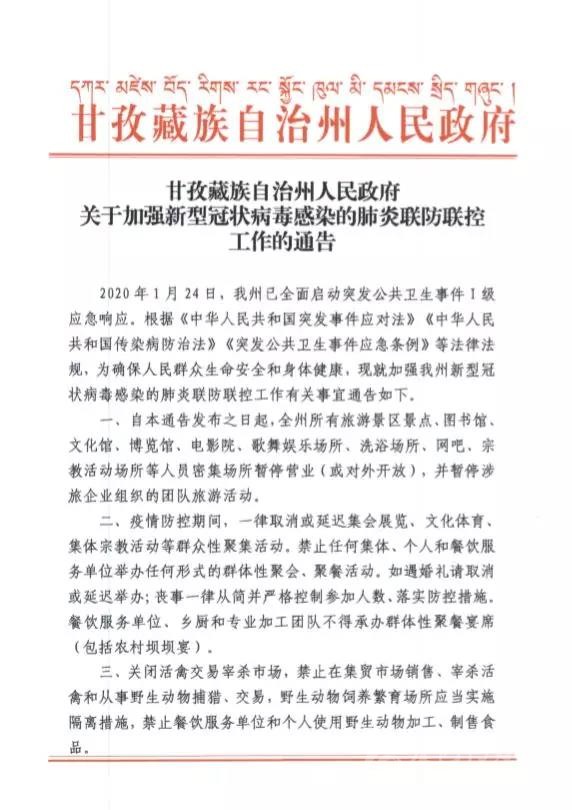 甘孜藏族自治州人民政府關于加強新型冠狀病毒感染的肺炎聯(lián)防聯(lián)控工作的通告