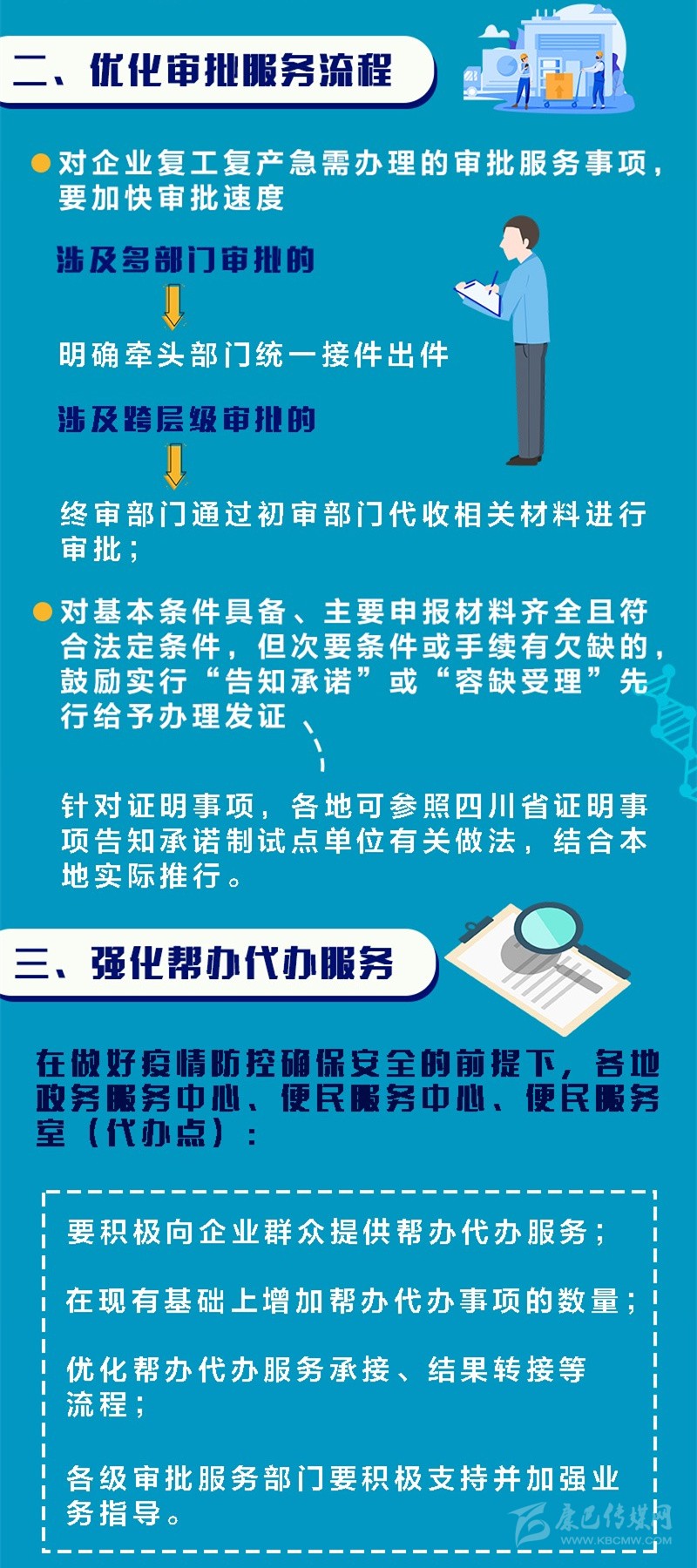 答:優(yōu)化服務(wù)流程,輔以靈活使用“告知承諾”和“容缺受理”等辦理方式。對企業(yè)復(fù)工復(fù)產(chǎn)急需辦理的審批服務(wù)事項,要加快審批速度,涉及多部門審批的,明確牽頭部門統(tǒng)一接件出件;涉及跨層級審批的,終審部門通過初審部門代收相關(guān)材料進行審批。