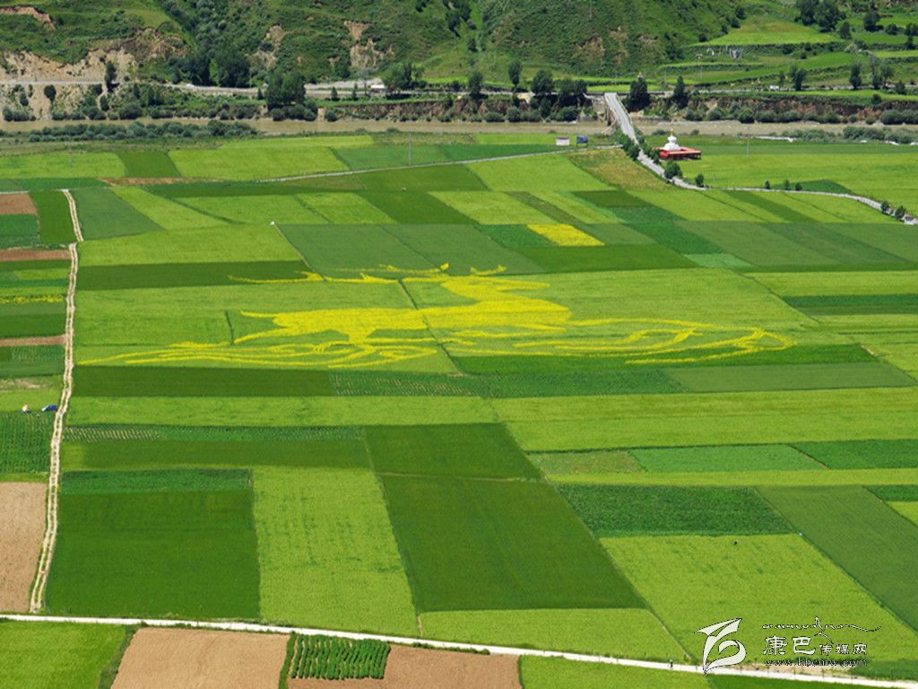 本網(wǎng)訊(記者 張兵 貢呷沙鄧 文/圖) 近日,記者在爐霍縣宜木鄉(xiāng)蝦拉沱村后山觀景平臺上看到一幅神奇的畫,在平坦的田野中清晰呈現(xiàn)出的一幅金鹿圖案,構(gòu)成圖案的材料是自然生長的油菜,襯托畫面的是正在不斷成熟的青稞。據(jù)縣農(nóng)牧和科技局領導介紹,這是該縣今年實施創(chuàng)意觀光農(nóng)業(yè)、全力發(fā)展休閑觀光農(nóng)業(yè)的成果。
