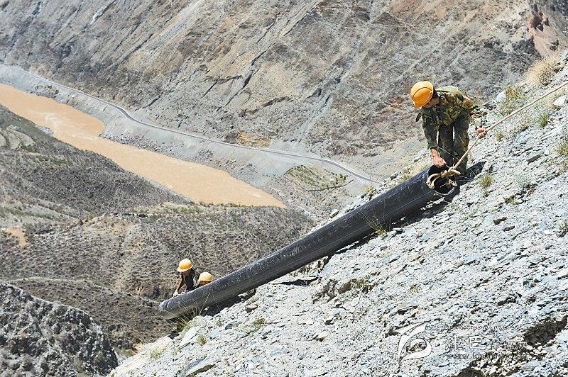 為解決曲雅貢鄉(xiāng)因都壩村1200畝農(nóng)田水管老化漏水、灌溉困難的問題,得榮縣今年4月啟動了“農(nóng)業(yè)灌溉節(jié)水工程”,需要通過人工從12公里遠(yuǎn)的水源地——真康壩取水點(diǎn),用管道把水引到因都壩村。完成這一引水工程,工人們要在金沙江畔陡峭的懸崖峭壁之上鋪設(shè)一條“空中水路”。據(jù)悉,該工程預(yù)計今年10月完工。