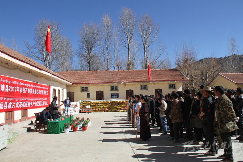 在農(nóng)科所院壩,擺放著縣委政府多方籌資,縣農(nóng)牧和科技局調(diào)運(yùn)和貯備脫毒馬鈴薯種60萬(wàn)公斤,青稞良種30萬(wàn)公斤、農(nóng)膜10噸、肥料120噸、各類蔬菜油菜良種3000公斤,35萬(wàn)元的黑木耳菌種,分發(fā)給24個(gè)鄉(xiāng)鎮(zhèn)、37個(gè)脫貧村。為趕這趟“理塘縣2017年農(nóng)牧產(chǎn)業(yè)扶貧放心農(nóng)資發(fā)放儀式”、“理塘縣成片成帶推進(jìn)特色產(chǎn)業(yè)發(fā)展啟動(dòng)儀式”,降央吉稱專門起了個(gè)大早,開著拖拉機(jī)“趕”了兩個(gè)小時(shí)到了農(nóng)科所。