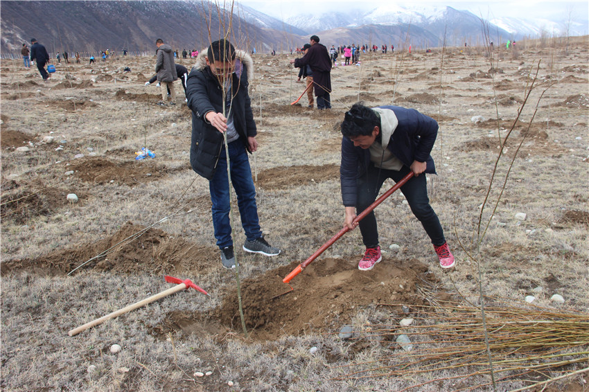 當天早上10時許,洛須鎮(zhèn)正科鄉(xiāng)曲德村的植樹現(xiàn)場一派熱火朝天的景象。參加植樹的人們,個個熱情洋溢、干勁十足。有的拿鐵鍬,有的提水桶,有的栽樹、蓋土……每一道工序都嚴格按要求進行。兩個小時后,一排排樹苗整齊地佇立在藍天下,就像列隊整齊等待檢閱的士兵。