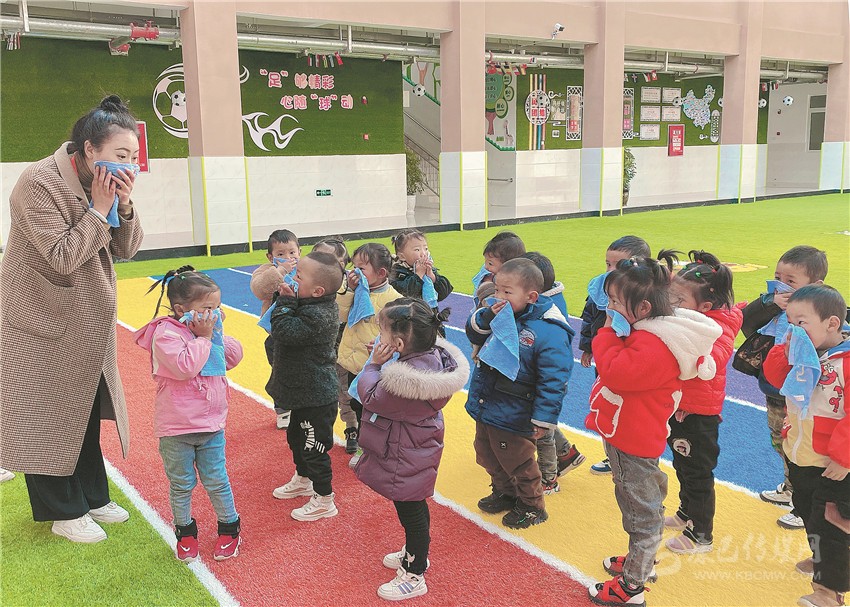 圖為該縣高城鎮(zhèn)幼兒園老師正在示范引導孩子學習防火技能。