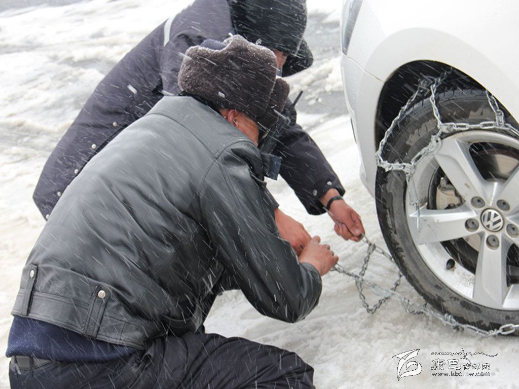 王洛讓在雪地里幫助外地車(chē)輛掛鏈條。