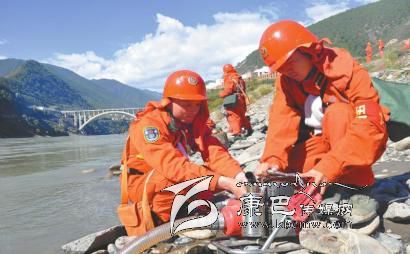 圖為徐驊(右)和戰(zhàn)士在架設(shè)水泵準(zhǔn)備滅火。 (武警四川省森林總隊甘孜州支隊供圖)