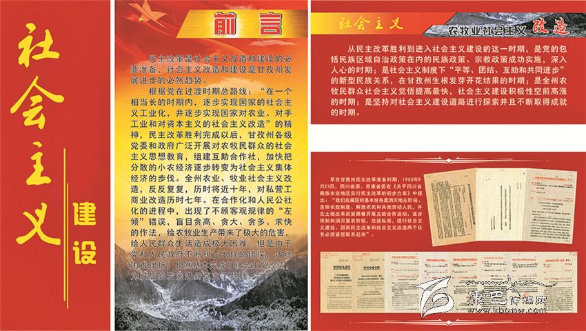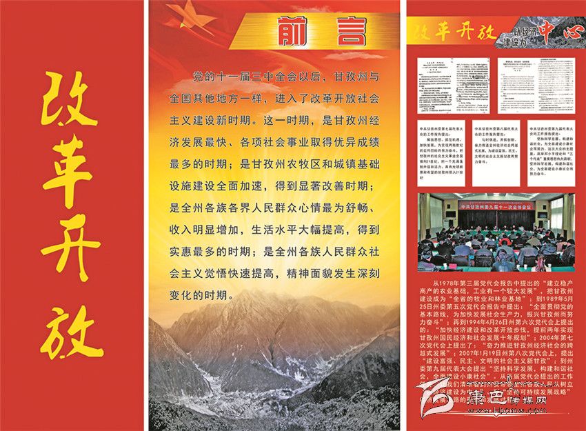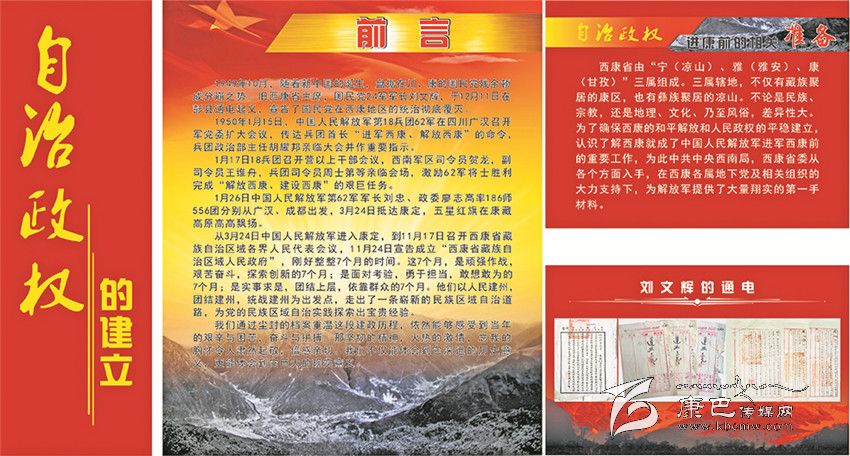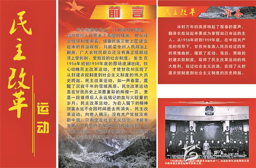 《甘孜州檔案館愛國主義教育基地》的整個展覽分為四大板塊。第一部分命名為“自治政權(quán)的建立”,向參觀者介紹了甘孜藏族自治州誕生的歷史過程;第二部分是“民主改革運動”,把人們帶回了那段不能忘記的烽火歲月;第三部分是“社會主義建設”,深情地回顧了在建設社會主義事業(yè)中我州所取得的不平凡的成就;第四部分是“改革開放”,讓人們重溫了在改革開放的大潮中所經(jīng)歷的那些充滿激情的經(jīng)歷。