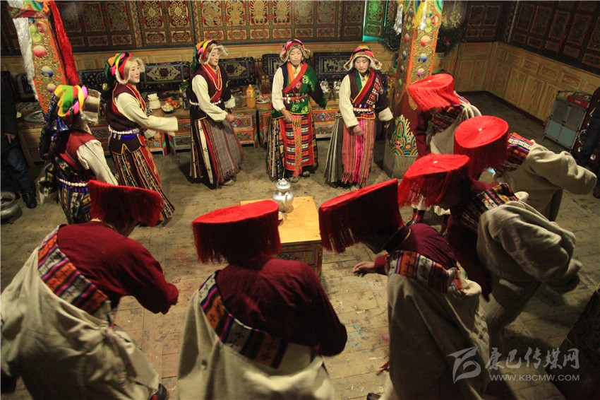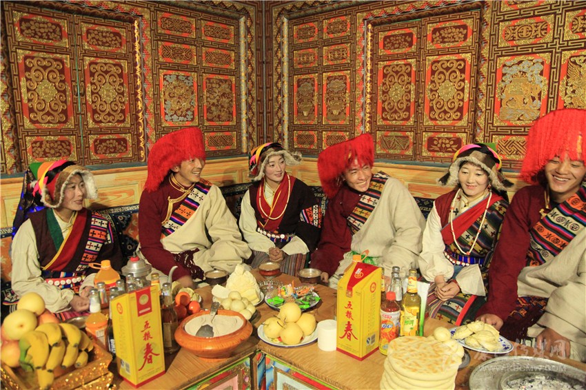 一家人穿上節(jié)日盛裝,按輩序就座。主婦手捧吉祥斗恭恭敬敬地走到長(zhǎng)輩跟前說“扎西德勒”,對(duì)方抓幾粒麥子邊向上撒邊祝福說:“扎西德勒!美滿幸福,祝主婦身體健康,預(yù)祝明年大家仍如此團(tuán)聚歡慶。”再抓一點(diǎn)切瑪送進(jìn)嘴里。家庭儀式后,家中兩人一個(gè)拿青稞酒、銀酒碗,一個(gè)手捧切瑪,到左鄰右舍、親朋好友家拜年,敬獻(xiàn)切瑪、青稞酒,互相祝福。
