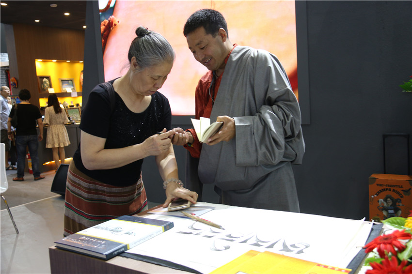而在同一地點(diǎn)的另一側(cè),省級藏文書法傳承人巴松鄧珠的藏文書法也吸引著眾多愛好書法市民前來觀賞,還有的與他合影。“指導(dǎo)過我的書法家非常多,他們不僅給了我許多寶貴的意見,更重要的是給了我信心和動力,讓我堅(jiān)持寫書法,并成為康體藏文書法的傳承人?!卑退舌囍檎f,這次能夠得到州委、州政府搭建的平臺,我會珍惜好這次難得的機(jī)遇,把作品展示好、宣傳好,讓全國各地的人們更多地了解我州民族文化。