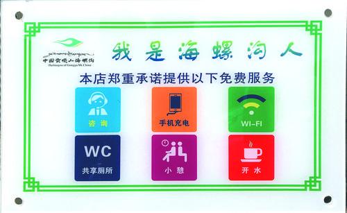 “我們長征大酒店在提高服務(wù)質(zhì)量的同時也掛了這個牌子,我們承諾為客人提供免費(fèi)的開水、充電、共享廁所等服務(wù),讓客人對海螺溝有一個美好的印象,在海螺溝過的開心愉快?!遍L征大酒店負(fù)責(zé)人楊德黎說。