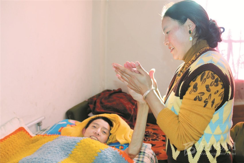 記者看到,根絨一家住的房子雖然簡(jiǎn)陋,但卻充滿了愛意。每個(gè)房間收拾得整整齊齊,久病臥床的根絨雙目有神,衣著干凈,房間里聞不到任何異味。根絨笑著說:“都是我妻子的功勞,她愛干凈,每天都給我收拾得干干凈凈的。”