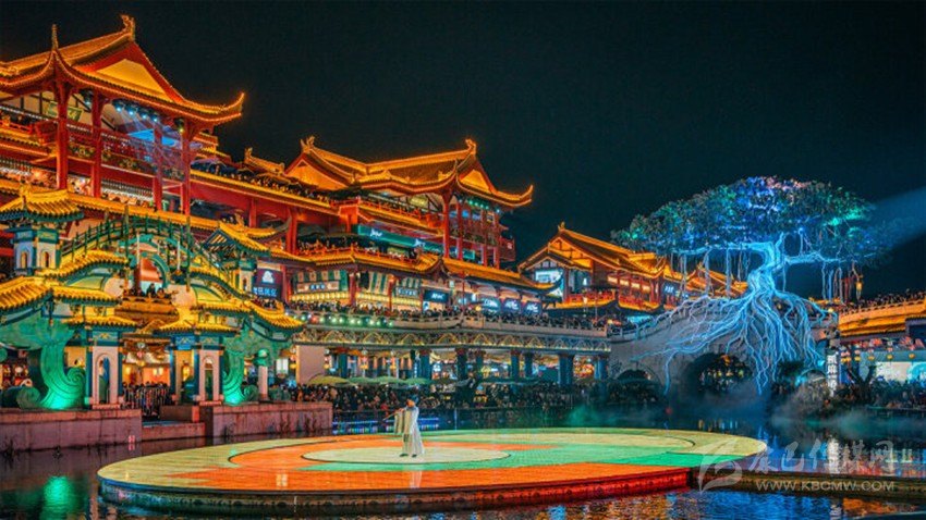 走進(jìn)“穿越盛世”商業(yè)水街,只見氣勢恢宏、紅墻青瓦的古風(fēng)建筑群翹角重檐、臨水而立,河燈、“神樹”、畫舫、橋廊共同織就瑤池天街。